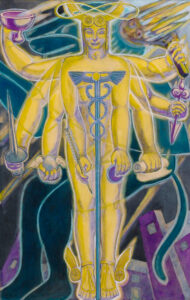 Soon after they began to work on the Tarot, they realized that the traditional descriptions of the cards were inadequate.  Harris suggested that Crowley consider creating a more elaborate deck based upon his knowledge of the occult.  Crowley would of course take her suggestion and so they began corresponding and whenever possible, they would meet to discuss the project.  Crowley would regularly send Harris descriptions of the cards which at times included rough sketches.  Harris would then execute the work as per her teachers’ instructions and then present them to him later for approval.  This process repeated until each of the deck’s 78 paintings met with Crowley’s expectations. He would be demanding throughout the project, often turning away paintings he felt were in adequate.  This resulted in Harris having to repaint over a dozen images, including the Magus card which she is known to have painted at least seven times.  The pressure taxed their relationship but after five years of agonizing work, what is likely the most beautiful tarot ever executed—the Thoth Tarot—was complete.  Crowley would later write of the Thoth Tarot, “It is the vindication of my life’s work for the last 44 years; and will be the Compass and Power of the good ship Magick for the next 2,000 years.” In 1944 the Book of Thoth was published, and Crowley would acknowledge Harris’ contributions in the book’s Introduction, writing;