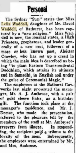 Waddell was an Australian violinist of considerable talent. She was born in Bathurst, New South Wales on the 10th of August, 1880. She was the daughter of David Waddell and Ivy Lea Bathurst of Randwick, New South Wales. Waddell began playing violin at the age of seven and quickly became adept. She would later teach violin at the Presbyterian Ladies’ College in Croyton. She also taught at two girls’ boarding schools: Ascham in Edgecliff, and Kambala, an Anglican school in Rose Bay. She toured abroad as a professional violinist, which led to her performing as part of the Ladies’ Orchestra in George Edwardes’s A Waltz Dream, at Daly’s Theatre in Leicester Square on January 17th of 1911. It was while playing in London that she met Aleister Crowley, who fell madly in love with her.