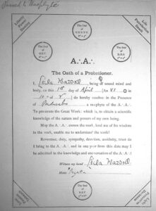 Waddell was admitted to the A∴A∴ on April 1, 1910. Crowley called her Laylah and she became one of the most important Scarlet Women. Her now iconic image appears in The Book of Lies in the chapter which includes her name. She famously played violin during the first performance of The Rites of Eleusis, at London’s Caxton Hall in 1910. A few years later, when Crowley staged a declaration of the Irish Republic at the base of the Statue of Liberty, she accompanied him on violin. Laylah would also inspire several poems by Crowley, who dedicated two short stories to her, The Vixen and The Violinist.